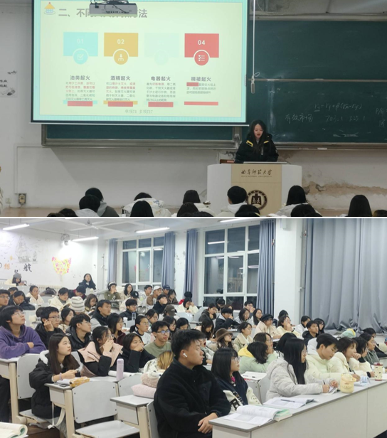 本次宣讲会分为“防火、防电、防诈骗”三个部分开展宣讲。首先,主讲人围绕宿舍火灾隐患,对火场自救办法与不同火灾的扑救方法进行讲解,引导学生在面对火情时要沉着应对、有效处置,通过视频的形式对灭火器的使用方法进行说明;随后,宣讲团成员针对电梯乘坐及触电急救展开讲解,提出安全乘坐电梯十大要点内容;最后,宣讲团成员重点介绍了常见的诈骗手段和相关防范措施,引导学生提高警惕,增强自我保护意识。