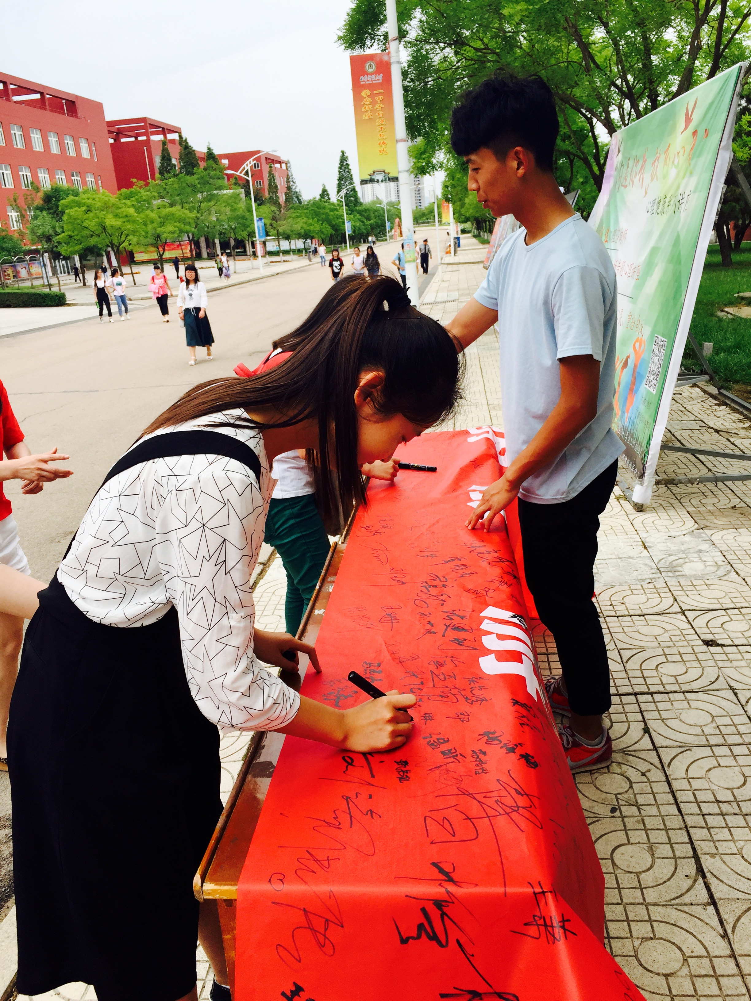 经过前期充足的准备,利用QQ空间、微信等新媒体平台进行线上宣传,积极响应“文明旅游”号召,此次签名活动得到了我校师生的广泛支持。活动现场,海韵学社成员积极引导广大师生承诺“文明旅游,我在路上”。在工作人员的引导下,同学们依次有序地在横幅上签下自己的姓名,承诺在旅游活动中争做文明游客。截止活动当日12时,共有百余名师生参与其中。学社成员在现场为同学们宣传《文明旅游倡议书》相关内容,倡导 “爱旅游、爱生活、爱自然、保护环境”的文明行为,提升文明旅游素质,鼓励大家文明出行。