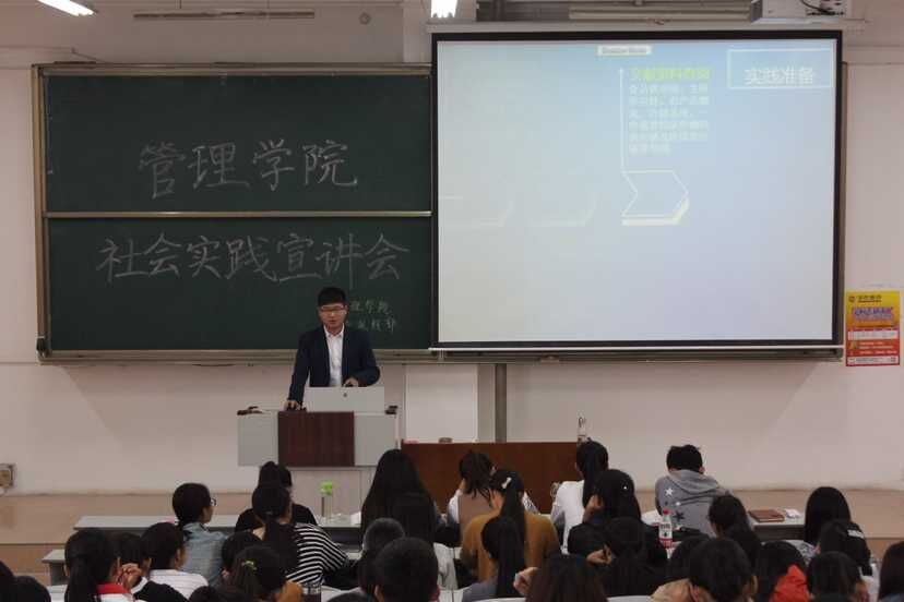 宣讲会伊始,社会实践部部长徐晓辉用PPT向大家展示了历年社会实践活动的精彩瞬间。紧接着,徐晓辉从含义、目的及意义等方面介绍了什么是社会实践,并以“梦八”队的获奖作品为例,从结构、内容方面介绍如何写好一份社会实践报告。随后,副主席袁晟睿以他自己社会实践的经历,从实践准备、实践过程、实践成果、媒体关注、感悟总结几方面详细讲解了如何组织并完成一次社会实践活动。最后,徐晓辉对这次活动做了深刻总结,并鼓励同学们积极参加社会实践活动。同学们仔细听讲,认真笔记。
