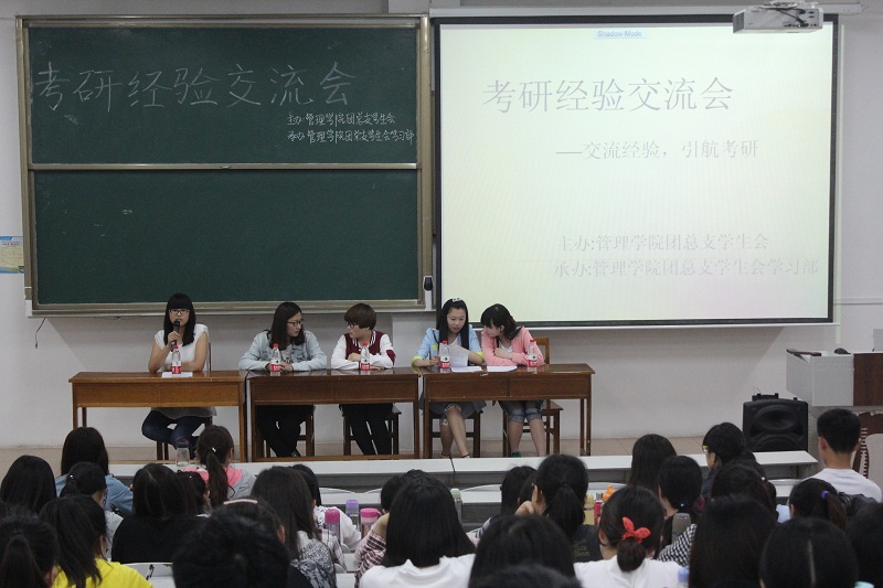 此次考研经验交流会吸引了众多具有考研意向的同学前来参加。在主持人简短幽默的开场白之后,各位优秀学生代表依次发言。五位嘉宾从自身考研经历出发,轮流讲述了考研心路历程和宝贵经验。分别就院校与专业选择,各门课程的复习规划以及考研过程中心理准备与调适等问题与同学们进行了交流。他们将自己的经验教训与同学们无私分享,谈吐之间透露出其语言功底的深厚扎实,风趣幽默的谈话更博得了同学们阵阵掌声。在期待已久的现场提问环节中,同学们纷纷就各自情况对考研各方面提出问题,嘉宾们也依据自己的经验和看法耐心地为他们进行了分析。嘉宾们倾囊相授,同学们细心聆听,整个交流会现场热情洋溢。最后,主持人进行了总结发言,交流会在同学们热烈的掌声中圆满结束。
