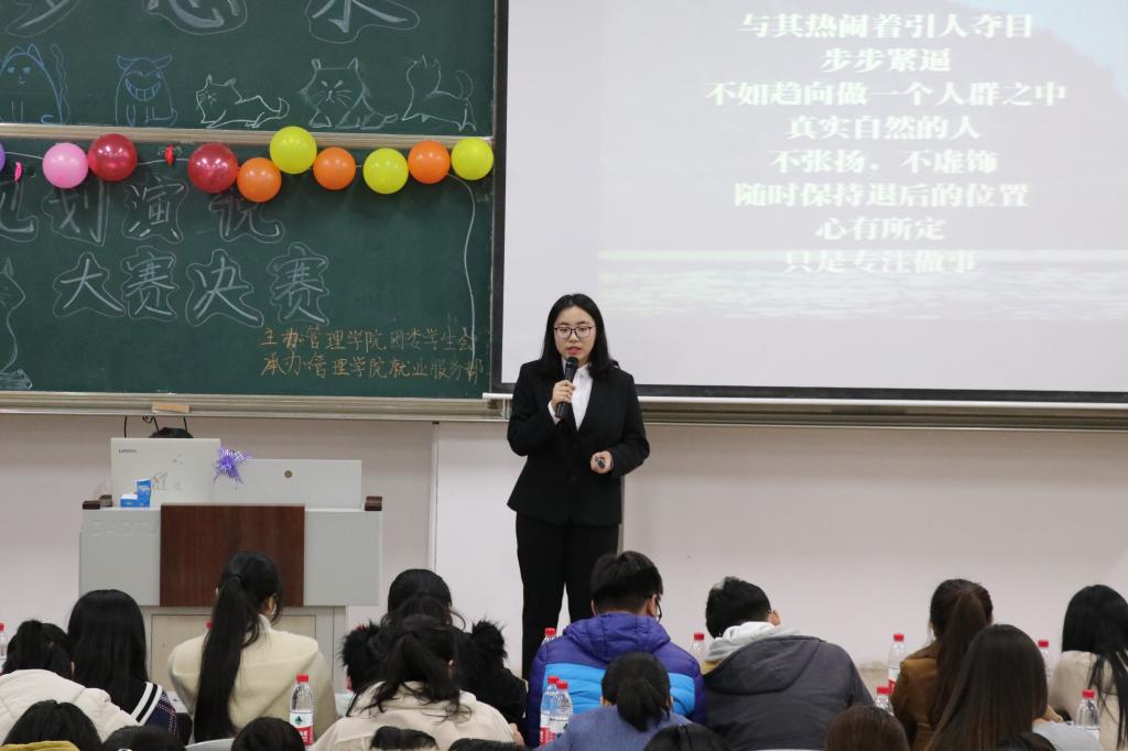 经过学院内选拔推荐、复赛筛选等环节,最终共有8名优秀选手入围决赛。决赛分为风采展示,主题辩论和主题演讲三个环节。在风采展示环节中,选手们分为“通才队”和“专才队”两支队伍,以不同的形式展现了团队职业风采和魅力。主题辩论环节,选手们针对“通才好还是专才好”展开激烈辩论。辩论过程中,选手们表达流利,思维严谨,互不相让,赢得了观众的一致好评。在最后主题演讲环节,选手们通过幻灯片分别从自我评估、环境分析、目标决策、实施方案等方面向观众和评委们畅谈了自己的职业规划,充分展现了当代学子朝气蓬勃的精神风貌和职场新人锐意进取的新形象。最终,李梦麒选手凭借出色的表现荣获大赛第一名。