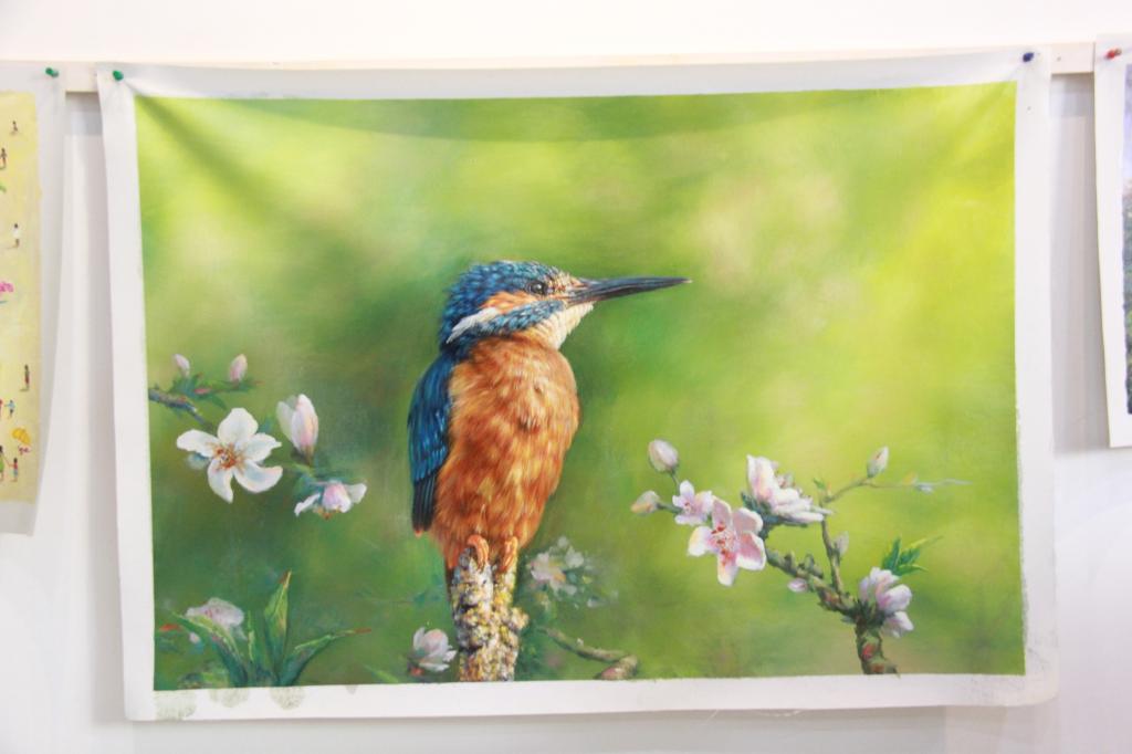 交流参观过程中,李经理带领实践队员参观了一间间居室,感受油画中凝固的永恒美,队员们纷纷被画家们巧妙的画工折服。随着参观调研的深入,实践队员有幸来到油画大师张老师的工作室,此时张老师正在进行主题为“秋色”的新油画创作,作品出神入化大气磅礴,用缤纷的色彩来展现想象的思绪。张老师介绍到:“油画讲究的是技法和色彩,用色彩表现画面的实,虚,浓,淡,用颜色堆厚做肌理效果,同时强调空间和体积,进行明暗对比。”近年来,在油画界,中西两方相互借鉴相互学习,西方油画有了线条美,中国画也增加了透视感与体积感,从三点透视到多点透视,相互结合发展。