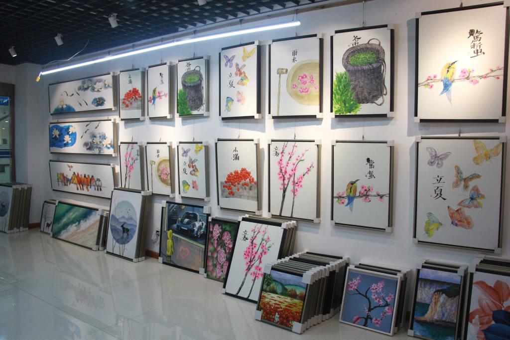 在张家楼镇驻地东侧,204国道以南,一幅“蒙娜丽莎”画像悬于墙上,十分抢眼。这幅画像所在的张家楼艺术博览城便是此次实践调研地点。且听画吟队带着前一天丰硕的调研成果,来到此处深入实践。艺博城经理李朋辉热情的接待了社会实践团队一行,并展开详细介绍:艺博城是青岛西海岸新区张家楼镇在特色小镇建设中打造的、具有区域文化特色的产业项目,其中布展了油画作品3万余幅,以经营油画、版画、水彩画、根雕、石刻以及琅琊古瓷等艺术品为主,通过为画家打造创作交易平台,配置相应工作室,为画家提供良好的创作发展环境,吸引广大优质画家签约入城进行创作。艺博城现有中国书画研究院院士、香港凤凰国际商学院美术系特聘教授孙一楠,当代著名油画家、中国美术协会会员谭群等40余人知名画家,画家们来到张家楼进行创作和发展,将其作品带到艺博城进行展览和销售,这有利的推动了艺博城新鲜血液的更替。