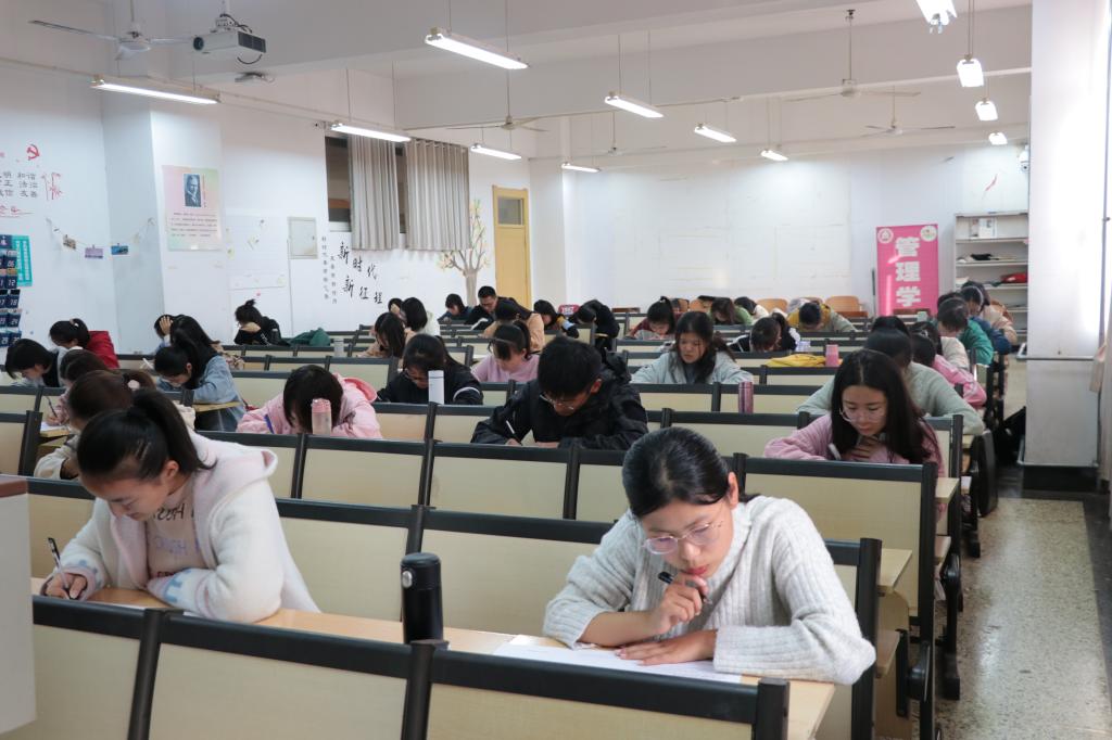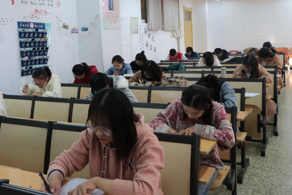 此次比赛以汉字听写为主,诗词成语为辅,采用试卷作答的方式进行传统文化综合素质的考察。参赛选手按照参赛序号上交手机至手机袋,充分保证了比赛的真实性与严谨性。比赛过程中,参赛选手认真答题,有的奋笔疾书,有的低头思索,凭借对国学经典的了解与热爱表达自己的理解,展现了扎实的文学功底。