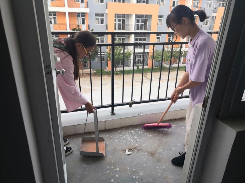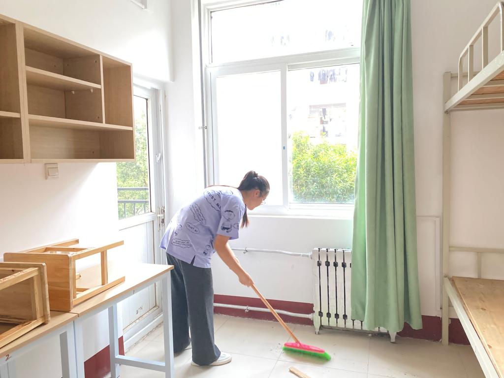 天高云淡,秋风送爽。15日清晨,迎新工作人员早早在宿舍楼下排队等待,清点新生住宿必备的被褥、暖瓶、脸盆等物品。随后,各队人员分工协作、快速行动,按照各宿舍相应新生人数领取住宿物品,确保无疏漏。16日,迎新人员对宿舍进行专门打扫与消毒。工作人员快速分工,各自扫地、拖地、擦拭桌椅、消毒,细心打扫每一处角落,无论是寝室地面,还是桌椅走廊,都进行了彻底清洁。同时,技术人员对宿舍进行了安全隐患排查并记录报修。