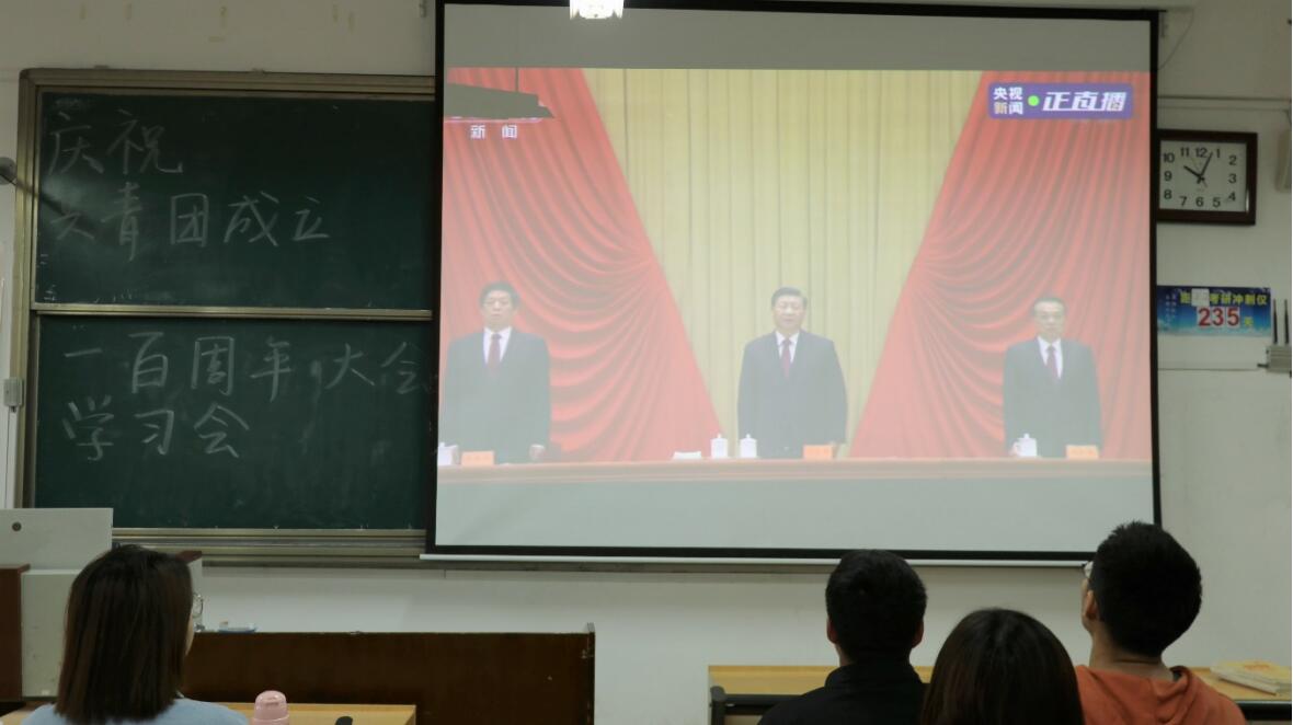 5月10日,庆祝中国共产主义青年团成立100周年大会在北京人民大会堂隆重举行。为落实“喜迎二十大、永远跟党走、奋进新征程”主题教育实践活动安排,水果派av 组织团委学生会、青马工程培训班、20级各班团支部全体成员集中观看会议直播。
