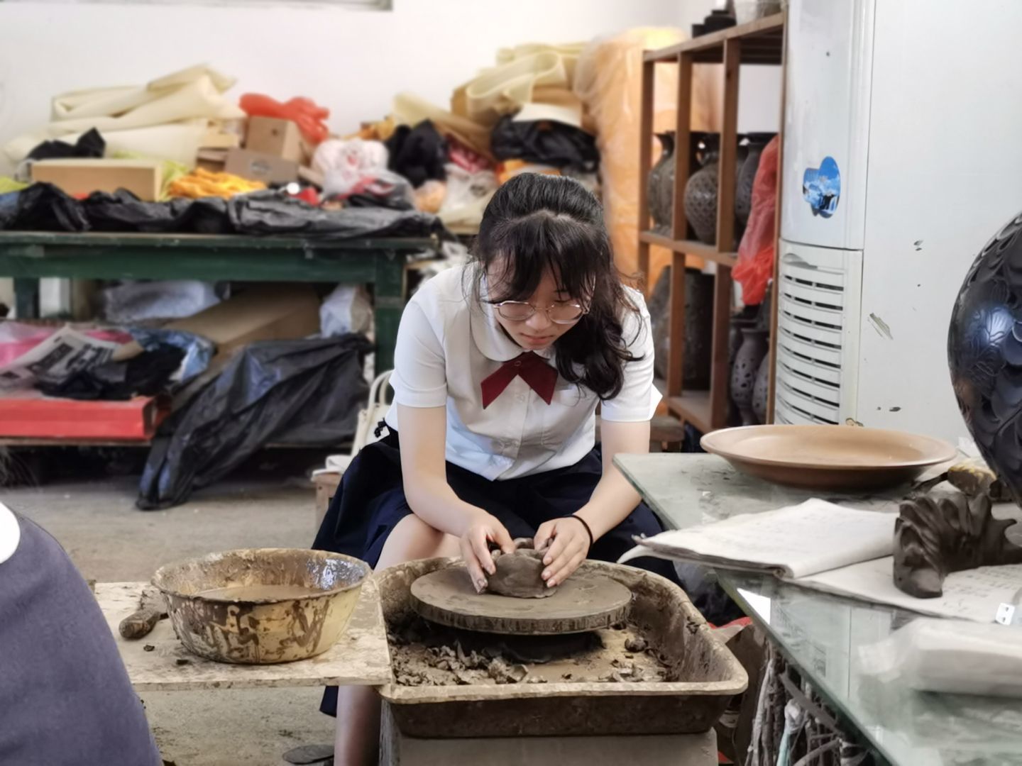 参观交流过后,刘加东老师邀请实践队员们使用陶土亲自动手操作,真实体验陶器的制作过程。双手沾水润湿,轻抚着拉胚机上细腻、润滑的陶泥。脚踩踏板,体验手中陶泥旋转时的快感。在此过程中,实践团成员都切实感受了黑陶文化的魅力和对匠人技艺的超高要求,对黑陶工匠精益求精的精神感到十分崇敬。队员在与刘老师的交谈中发现了他对黑陶工艺的热爱和对传承非遗的坚定信念,在他的身上似乎也能看到黑陶的特质:沉稳坚韧,热忱专注。
