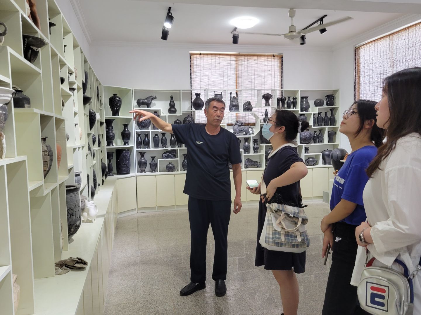 刘加东,日照黑陶烧制非物质文化遗产传承人,亦是日照市两城黑陶厂的厂长。他对于实践成员的到来表示热烈欢迎,第一时间带领其参观黑陶厂展览室,详细介绍黑陶厂的工作内容和烧制黑陶的工序。刘加东老师讲解道,因为当地土质细腻,颗粒大小均匀,颜色柔和,任何一个地方都无法复制,所以厂内烧制的所有黑陶都是就地取材。作为非物质文化遗产的传承人,刘加东老师在制作黑陶过程中,始终把传承传统工艺放在心上。一件上称的黑陶工艺品不仅需要优质的陶土,还需要娴熟的练泥、造型、打磨工艺。黑陶制作有专门的备用的土由水泥、粮食等制作而成,陶泥通过晾晒、过滤,入窑,最后再蒸发水分,制作过程漫长,一件黑陶作品从开始到最后成型大约要花费一个半月之久。