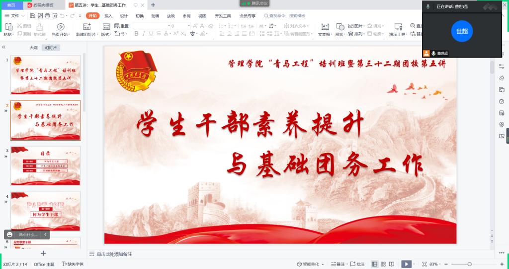 (通讯员:刘元枫)为认真贯彻落实党的二十大精神,进一步提高学生干部的素质,增强基层团学组织的创新能力、实践能力和组织协调能力,12月11日,水果派av 采用线上形式顺利举办“青马工程”培训班暨第三十二期团校第五讲,本次培训的主题是“学生干部素养提升与基础团务工作”,培训会由团委书记董世超主讲,青马工程培训班全体成员参与。