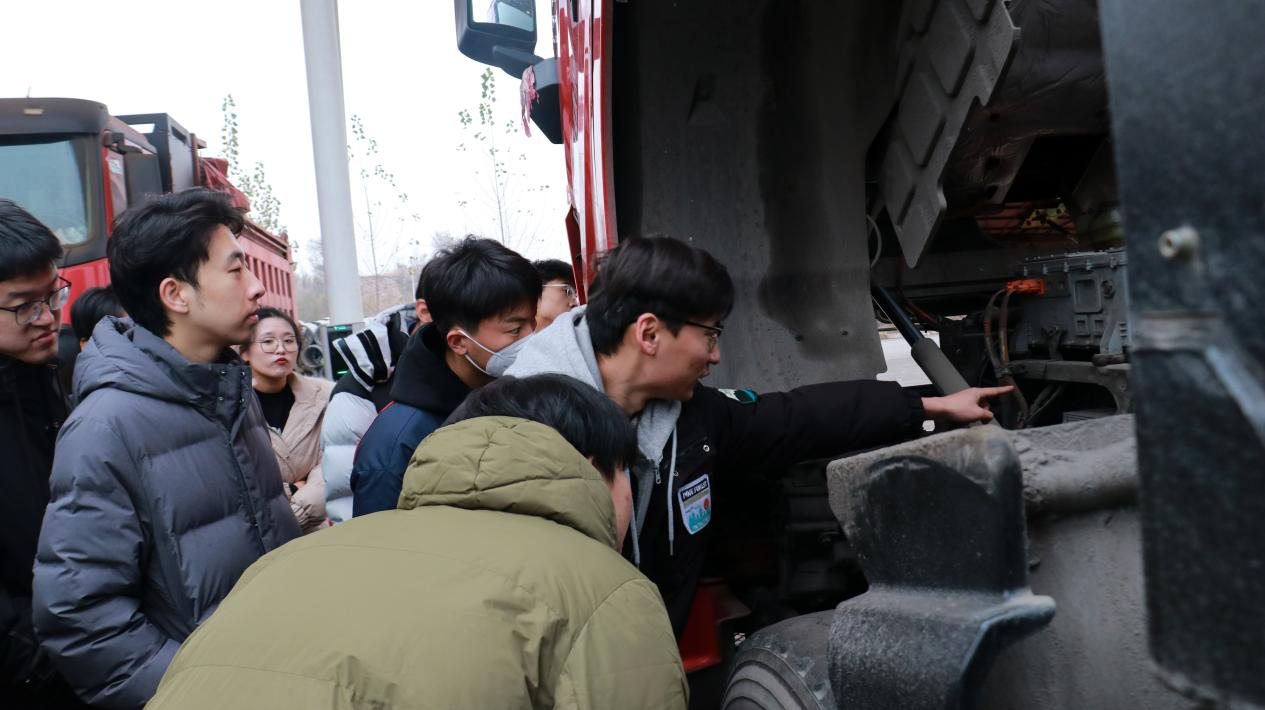 图为管院师生聆听企业负责人介绍车辆运作情况