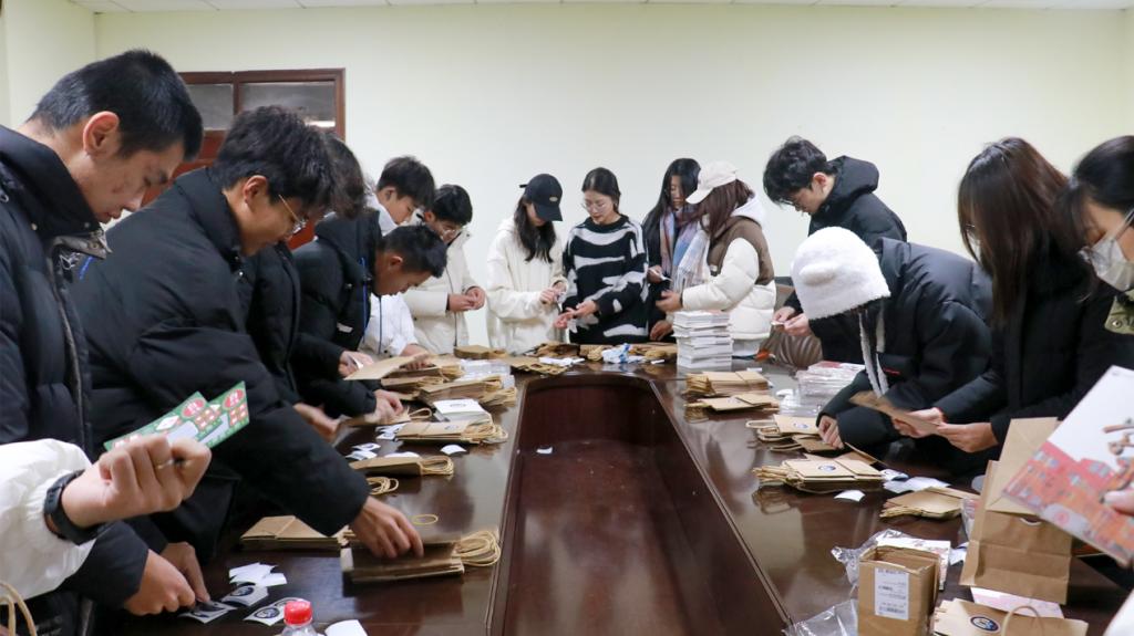 图为志愿者为考研学子准备礼包