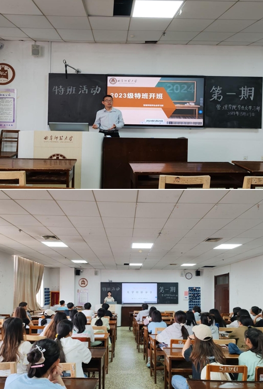 本次开班仪式分为两个环节,一是刘洪铎作开班宣讲,他表示,特班成立的初衷是实行特色化管理,旨在培养 “厚基础、精技能、有特色”的学生;他要求特班成员应具备成绩优异、参赛积极性较高、师生关系良好、自律能力强等优点,要求学生正视差距和不足,精准定位,全面提高综合素质;二是邀请2020级榜样学生作学习经验分享。许康就学习心得和考研两个方面进行了分享,他详细讲解了考研专业和院校的选择策略、备考方法以及情绪调节技巧;陈昕怡就学习规划、竞赛参与、考证准备以及生活平衡四个方面进行了深入分享,为同学们提供了宝贵的经验。