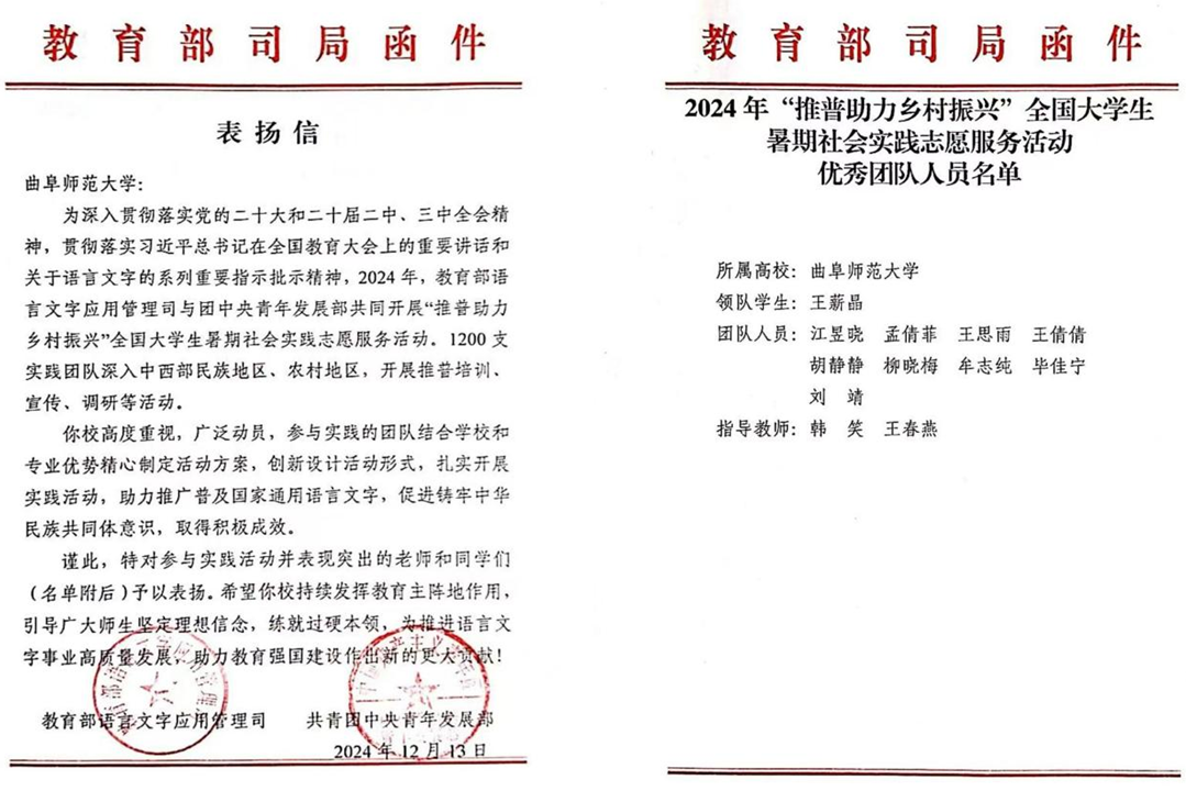 水果派av 2024年“推普助力乡村振兴”实践工作获教育部和团中央表扬