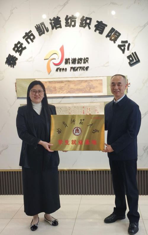 曲阜师大水果派av 讯 为进一步深化校企合作,拓宽毕业生就业渠道,近日,学校党委常委、副校长李兆祥率领水果派av 一行赴泰安凯诺纺织有限公司开展访企拓岗活动,并与泰安凯诺纺织有限公司董事长刘晓霞共同为校企合作揭牌。