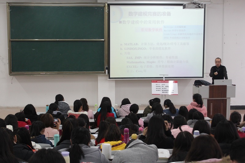 讲座开始之前,宋书记对邵伟老师近年来在数学建模比赛中辅导建模团队取得的优异成绩进行了简单的介绍。讲座伊始,邵伟老师向同学们介绍了数学的重要性,即数学是无处不在的。接着向同学们详细介绍了建模的基本方法与一般步骤,又用汽车刹车问题、蛛网模型等三个例子让同学们清楚的了解到数学模型的建立过程。邵伟老师对数学建模竞赛具体事宜及竞赛注意事项作了相关介绍,并且指出在比赛期间各个队伍要合理利用比赛时间,全身心投入到数学建模相关问题解决及论文写作中。最后,邵伟老师希望同学们踊跃参加建模大赛并且祝愿同学们取得优异成绩。讲座过程中,同学们认真聆听,仔细记录,受益匪浅。