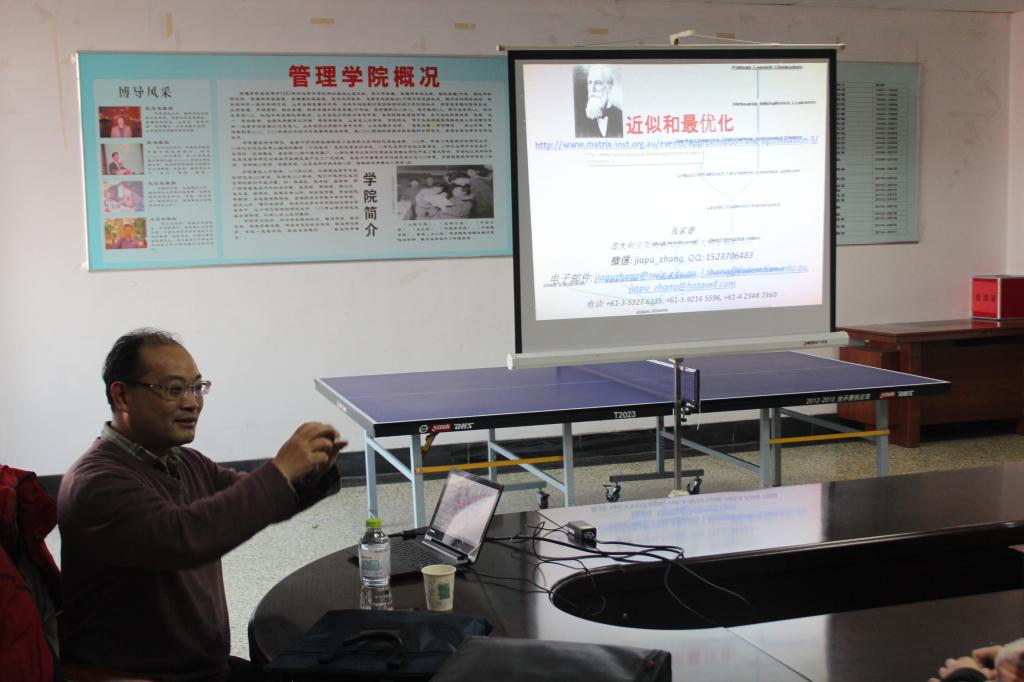 应学院的邀请,2016年12月6日下午,来自澳大利亚的张家普博士来水果派av 进行学术交流,做了题为“ChebyschevPolynomical Approximation”学术报告,同时,张家普博士还从自身的科研入手,以点带面介绍了最优化理论方面的专业知识、最优化理论与其他学科的交叉、科研课题的选题、发展等。张家普博士的报告让老师和同学们对最优化理论的应用有了更广泛的理解,为同学们学习最优化理论提供了更广泛的视角,让同学们更有信心和兴趣做最优化理论的研究,扩展了知识面,提升了研究兴趣,让老师和同学们受益匪浅。报告会结束后,张博士还和研究生同学进行了多方面的深入交流。会议由屈彪老师主持,学院相关教师和全体研究生参加。