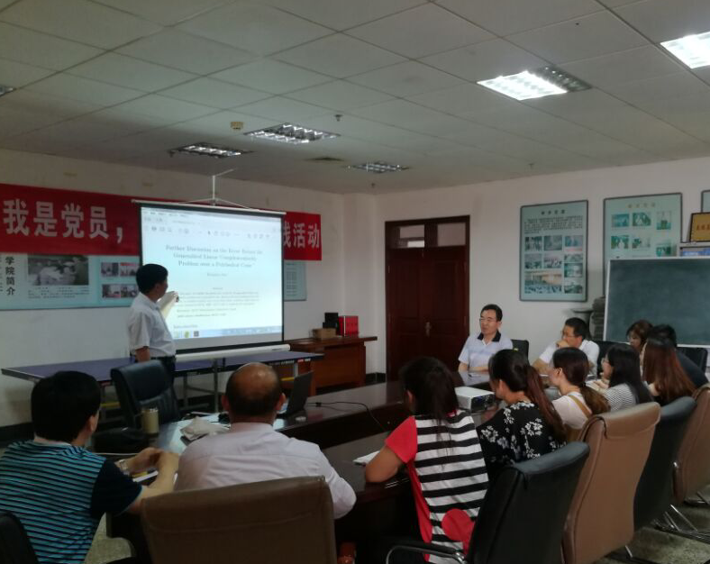 误差界是数学研究的一个基础课题,它在数学问题近似解的估计方面有广泛应用。对此,孙教授首先相信介绍了自己在广义线性互补问题误差界方面取得的成果,然后介绍了自己在张量互补问题误差界方面的最新成果,并给出了在实际中有广泛应用的强H-张量的若干判定条件。最后,孙教授就自己的科研心得与学院研究生进行了深入交流。