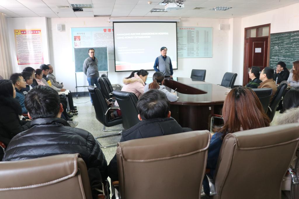 医疗运营是当前运筹与管理领域的一个研究热点。孟凡文博士首先介绍和总结了新加坡医院中存在的诸多问题,详细梳理了与这些问题研究相关的最新文献。针对上述现实问题,孟博士展示了他们在病床安排信息不确定性的条件下所构建的三类优化模型。然后,孟教授提出利用鲁棒优化的方法解决这些模型,通过详细介绍鲁棒优化方法的优点、运用技巧以及运用难点,孟教授展示了他们模型鲁棒解的求解过程和相关性质,并利用大量的现实数据检验了鲁棒解的稳定性和有效性。在报告完成后,孟凡文博士耐心细致地回答了老师、同学提出的问题,并与老师、同学进行深入的交流,令大家受益匪浅。
