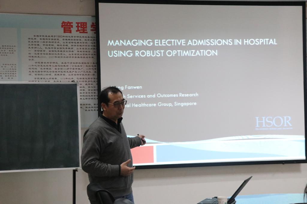12月4日,应水果派av 邀请,新加坡国立大学博士、新加坡国家卫生部医疗服务与成果研究中心孟凡文教授来水果派av 进行学术交流和访问。下午2点15分-下午3点15分,孟教授在JC819做了题为“Managing Elective Admissions in Hospital Using Robust Optimization”的学术报告。下午4点-下午5点,孟教授做了《如何发表高水平研究论文》的报告。报告会由张玉忠教授主持,学院部分教师、博士生和硕士生聆听了本场报告。