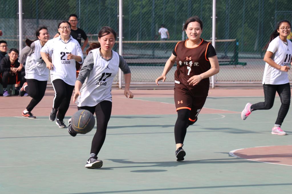 比赛分为男篮、女篮依次进行,女篮由毕业生组成的队伍与本科生组成的队进行对战,男篮由毕业生及教职工组成的队伍与本科生队伍相较量。
