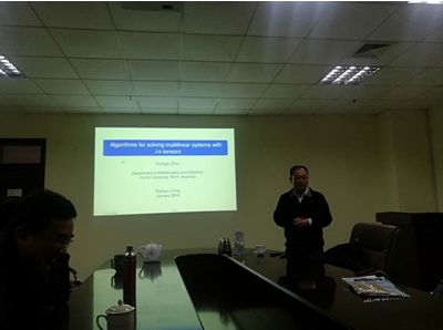 浏览量: 更新日期:2019-01-08应水果派av 邀请,2019年1月6日,澳大利亚科廷大学数理统计系周广路教授来水果派av 学术交流。水果派av 与信工学院部分教师与研究生参与学术交流。报告会由水果派av 王宜举院长主持。交流过程中,周教授首先谈到了张量优化研究的国际热点问题,并结合最新的研究成果做了两场高质量的学术报告。