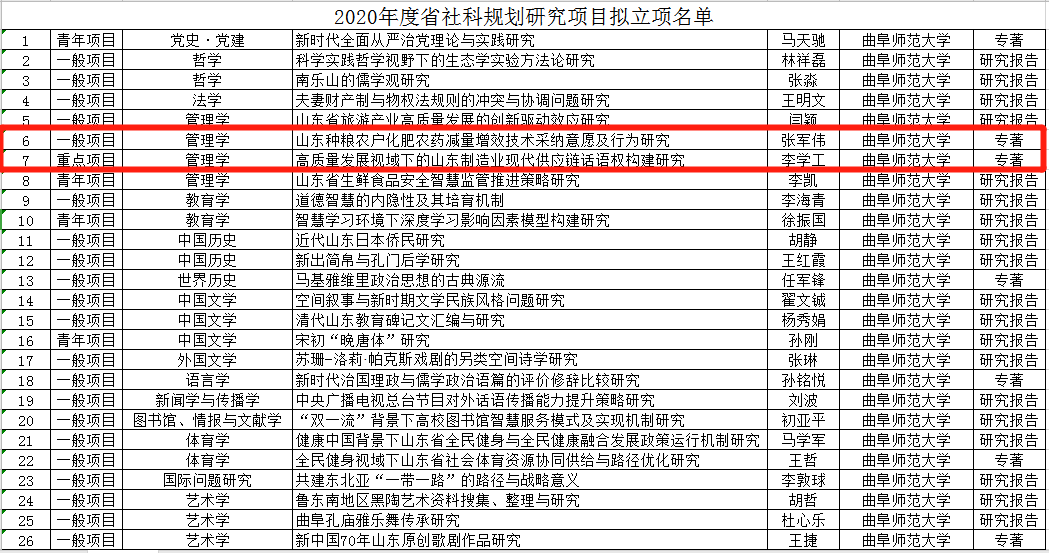 浏览量: 更新日期:2020-03-07日前,山东省社会科学规划管理办公室公布了《2020年度山东省社会科学规划研究项目拟立项名单》,此次曲阜师范大学共获批26项,水果派av 获批2项。其中,李学工教授的“高质量发展视域下的山东制造业现代供应链话语权构建研究”课题获批山东省社科规划研究重点项目,为此次获批的全校唯一一项重点项目;张军伟博士的“山东种粮农户化肥农药减量增效技术采纳意愿及行为研究”获批山东省社科规划研究一般项目。