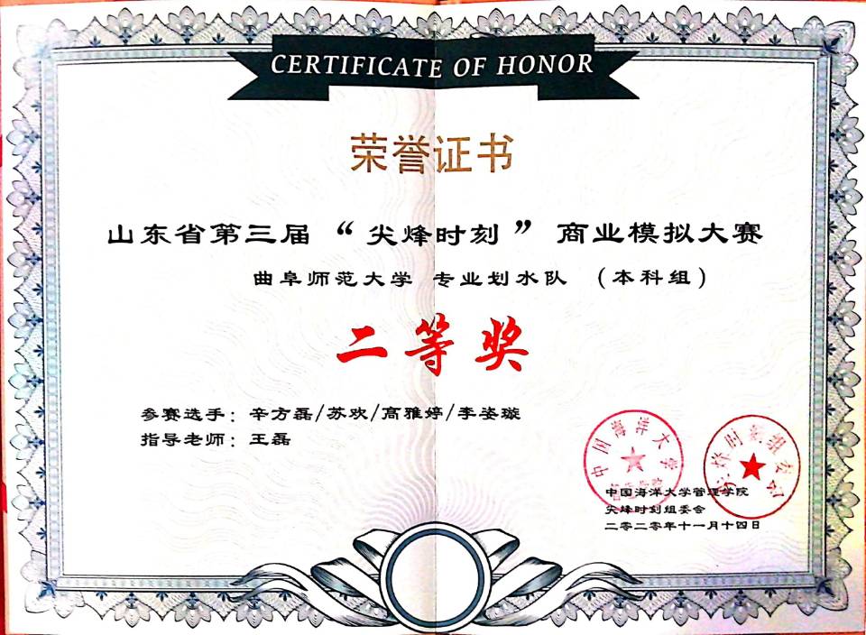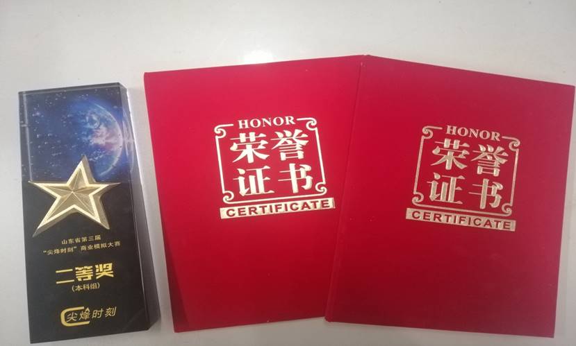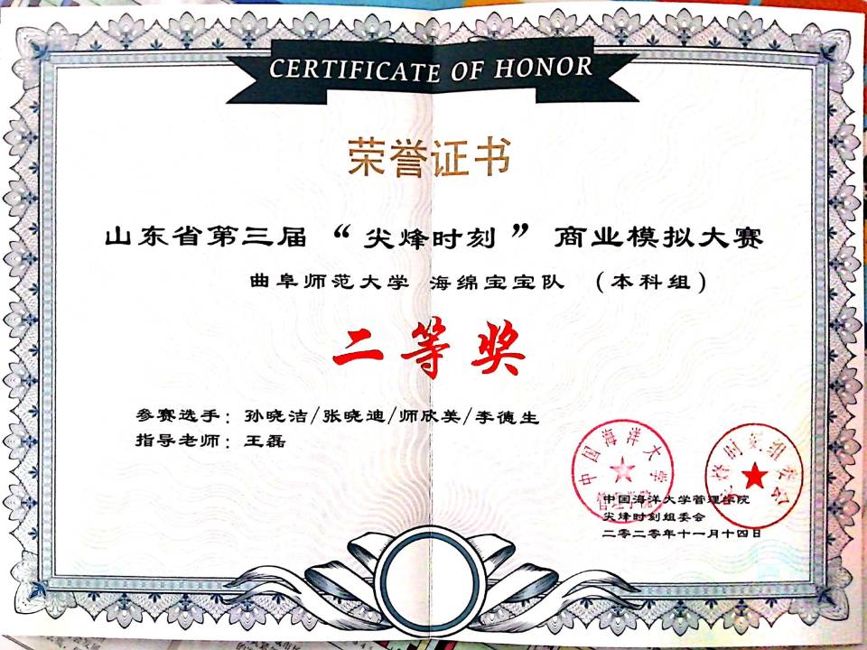 山东省第三届“尖峰时刻”商业模拟大赛总决赛获奖结果日前揭晓。水果派av 共四支参赛队伍,其中,由辛方磊、苏欢、高雅婷、李姿璇组成的专业划水队和孙晓洁、张晓迪、师欣美、李德生组成的海绵宝宝队荣获省级二等奖。