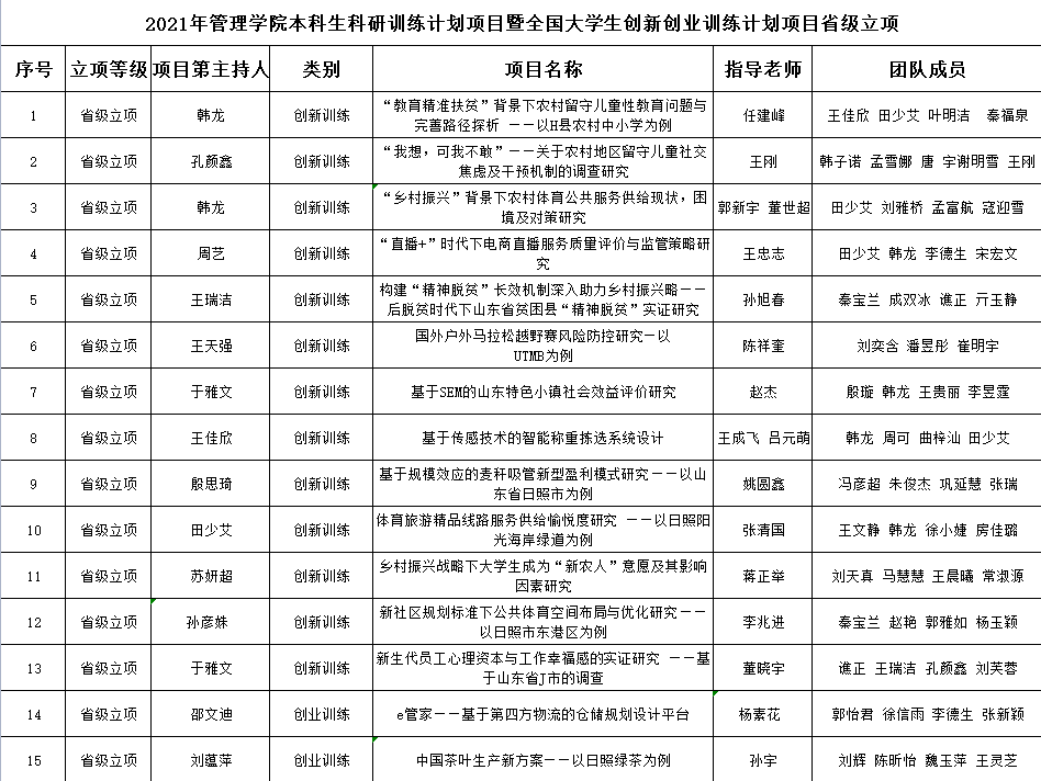日前,2021年本科生科研训练计划项目暨全国大学生创新创业训练计划项目省级立项评审结果出炉,曲阜师范大学省级立项项目共162项,其中,水果派av 占据15项,取得了傲人的成绩。