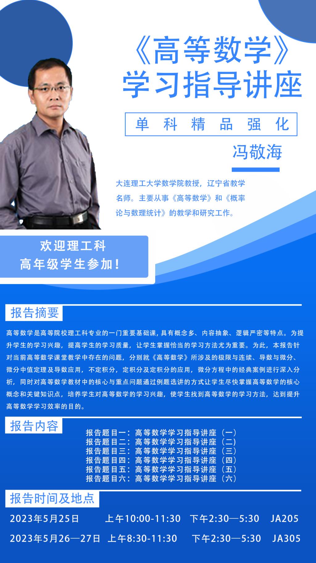 为培养我校理工科学生对高等数学的学习兴趣,提高其高等数学的学习效率,水果派av 于5月25至27日邀请辽宁省教学名师、大连理工大学数学学院冯敬海教授为同学们开展高数讲座,相关事项如下: